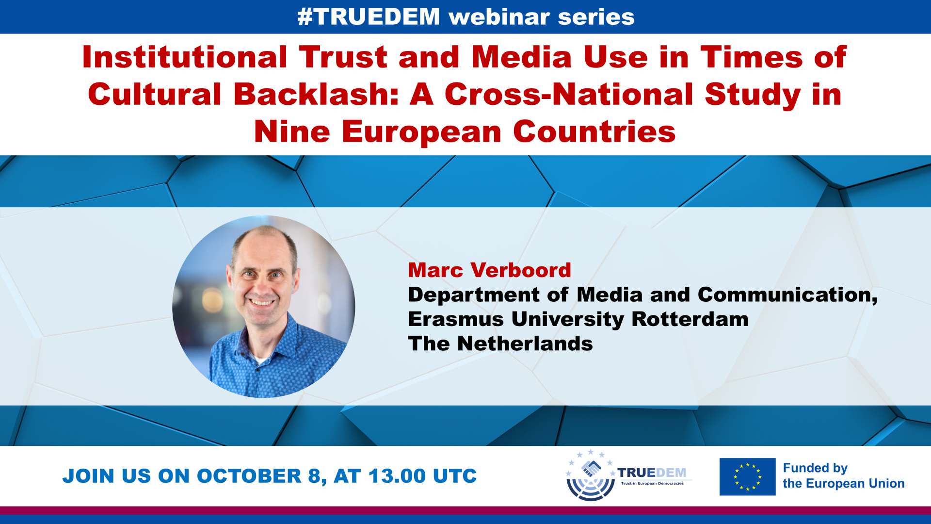The TRUEDEM project team invites you to attend the next webinar in the series dedicated to political trust research. In this webinar, our invited speaker, Marc Verboord from Erasmus University Rotterdam, will examine how institutional trust is shaped by both “cultural backlash” and media use across nine European countries. Drawing on representative 2021 survey data, the analysis highlights the interplay between values, political engagement, and patterns of news consumption, offering comparative insights into the drivers of trust in politics, media, and science. The webinar will take place today, on Wednesday, October 08, at 13:00 UTC. Learn more about the TRUEDEM webinar series here.